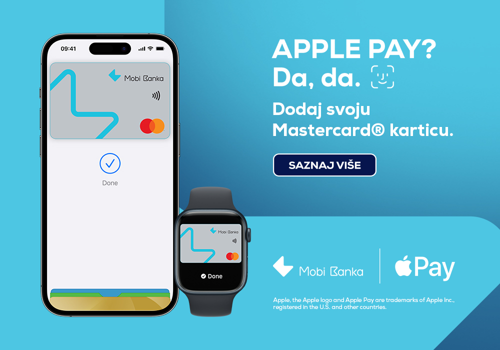 Svim korisnicima Mastercard kartice Mobi Banke dostupna je usluga Apple Pay, ukoliko koriste iPhone, iPad ili iWatch uređaje. Korisnici mogu brzo i komforno zameniti novčanik telefonom i sva mobilna, bezgotovinska plaćanja obavljati tako jednostavno.