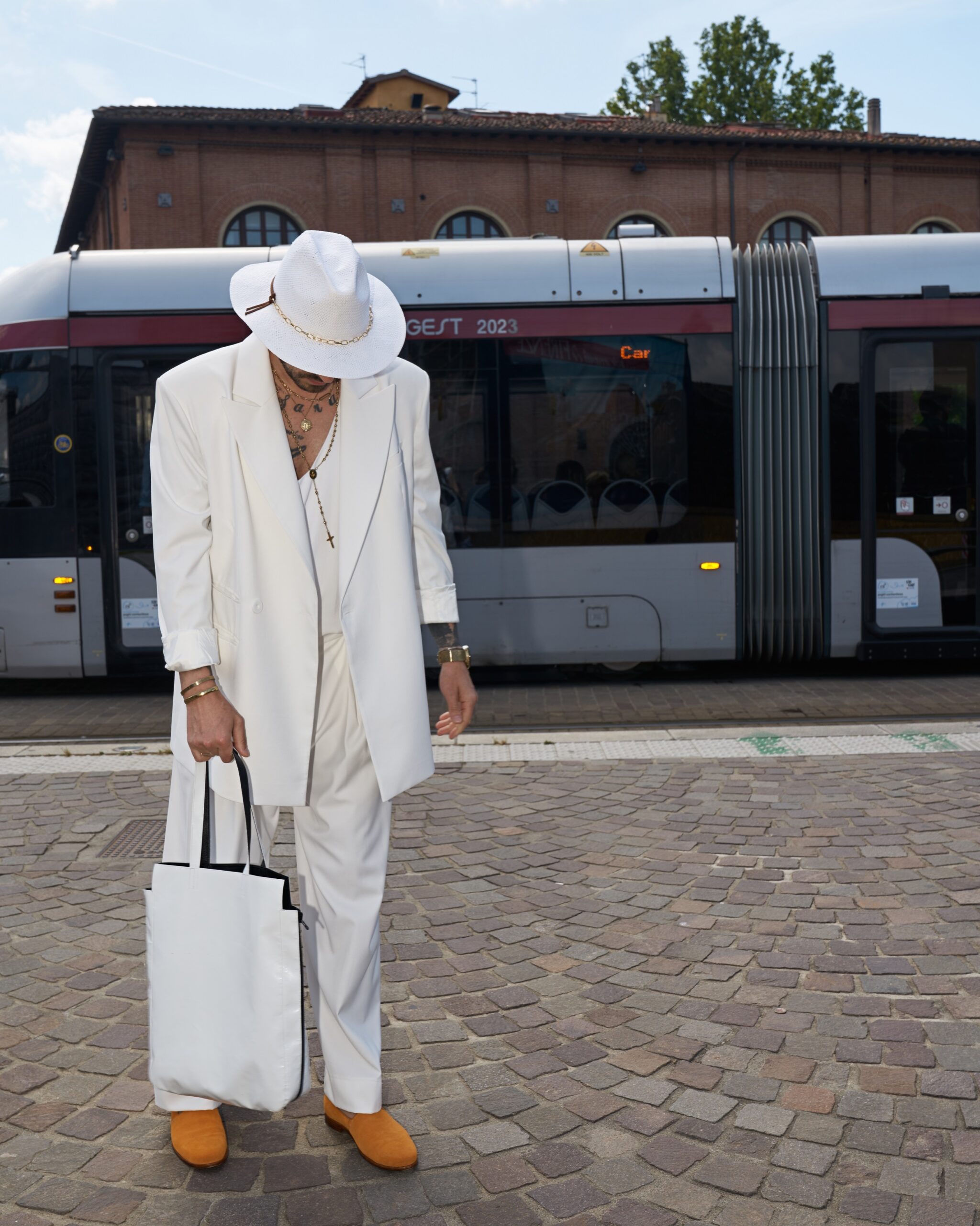 Poznati modni novinar i znalac sa adresom u Milanu – Josip Grabovac povodom 10 godina jubileja Sisters Code & Friends nosio je elegantno belo odelo na najpoznatijem sajmu muške mode “ Pitti Immagine Uomo “ u Firenci.