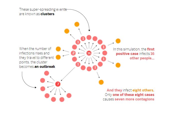 K faktor stoji iza nekih misterija pandemije. Prenošenje virusa u klasterima mogu da objasne zašto su neka mesta pogođena koronavirusom više od drugih. Ovo bi moglo delimično da bude slučajno: gustina naseljenosti, kulturni običaji i klima su faktori koji se obično spominju. Ali nekoliko studija ukazuje na super-prenošenje virusa na nekim događajima. Mnoge zemlje su imale uvezene slučajeve, tj. ljude koji su se virusom zarazili u inostranstvu, ali ove osobe su skoro uvek bile poput iskre koja se brzo ugasi, ali pod uslovom da ta jedna iskra ne zjapali ceo jedna klaster: na sahrani, pijaci, kol centru, staračkom domu ili na nekoj zabavi u zatvorenom prostoru.