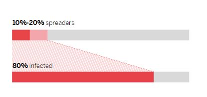 Ali postoje dokazi da se zaraze koronavirusom ne dašavaju na ovaj način, već ih pre diktira ono što se dešava u grupama ljudi. Istraživanje iz Londonske škole za higijenu i tropsku medicinu i nedavna studija objavljena u časopisu Nature ukazuju na to da su nekoliko događaja (poput probe hora ili sastanka u slabo provetrenoj prostoriji) i nekoliko zaraženih ljudi (koji možda imaju veće virusno opterećenje ili vrlo aktivan društveni život) odgovorni za veliku većinu zaraze. Procenjuje se da je 80 odsto prenosa virusa uzrokovano između 10 i 20 odsto pozitivnih slučajeva. Na primer, ako je pet ljudi imalo koronavirus, dvoje od njih ne bi zarazili nikoga, drugo dvoje bi mogli da ga prošire na po jednu osobu, a peta na osam drugih.