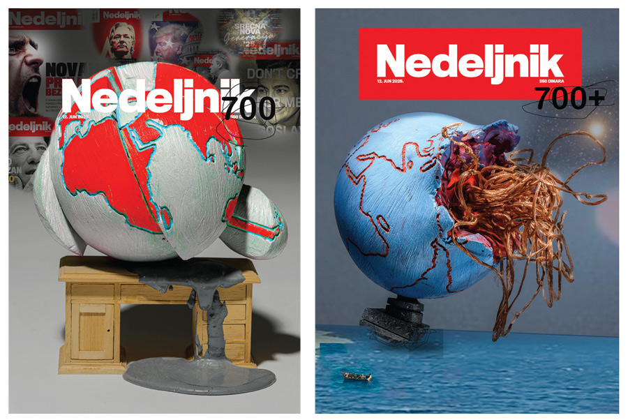 Kakav luksuz u ovom dobu. Čitati novine a ne znati unapred poentu. I tako već trinaestak godina. I još dugo i da budu još i puno, puno bolje. Mislim ako dobacimo. Ako dobacimo: kako lokalno, tako i globalno. Zato je prva naslovnica za minule radove, za ono što je iza nas – geostrateško tranžiranje globusa bačenog na neki radni sto (novinarski ili forenzičarski) iz koga curi crnilo (štamparsko ili neko drugo) i dijagnosticira sve što se dešavalo naokolo.