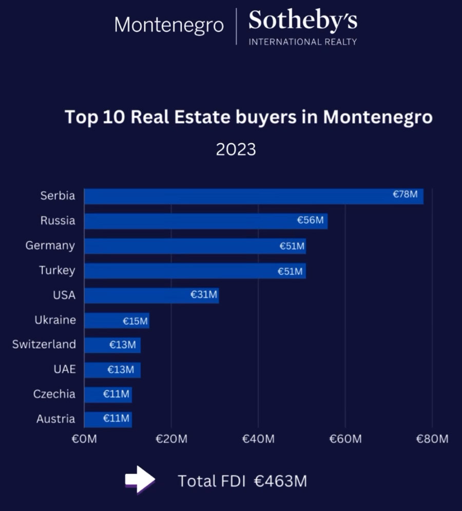 Podaci o FDI (direktne strane investicije) pokazuju da su državljani Srbije uložili 78 miliona EUR u nekretnine u Crnoj Gori samo u 2023. Na drugom mestu su Rusi sa 56 miliona EUR, a treće mesto „dele“ Nemačka i Turska sa 51 milion EUR. Na listi su još i državljani SAD, Ukrajine, Švajcarske, Ujedinjenih Arapskih Emirata, Češke i Austrije.