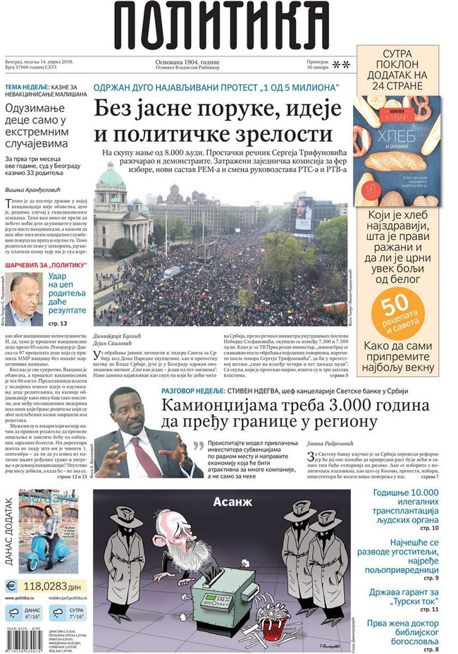 ZAHTEVI SA PROTESTA – Na jučerašnjem mitingu opozicije i građana koji je nosio naziv “Svi kao jedan – 1 od 5 miliona” organizatori su dali rok od šest dana vlastima da odgovore na tri zahteva koja su danas prezentovana sa bine koja je bila postavljena ispred Doma Narodne skupštine. Ukoliko se do petka ne ispune zahtevi (za petak 19. aprila je inače u Beogradu zakazan skup iz kampanje predsednika Srbije Aleksandra Vučića „Budućnost Srbije“), najavljen je novo protestno okupljanje za sledeću subotu.