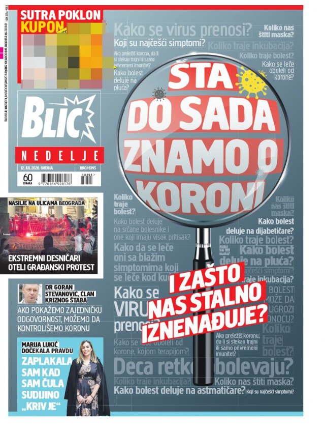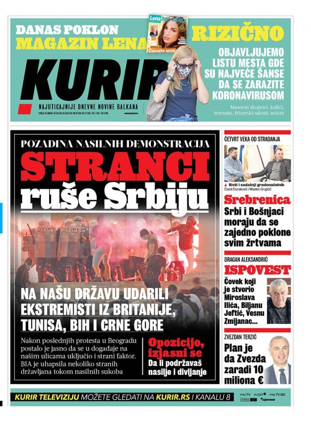 SzS TRAŽI PUŠTANJE UHAPŠENIH – Opozicija okupljena u Savezu za Srbiju insistira na hitnom ispunjenju zahteva koji bi obezbedili zaštitu zdravlja građana i njihovog dostojanstva, među kojima je pre svega hitno puštanje neopravdano uhapšenih građana tokom protesta, saopšteno je u subotu. SzS je zatražio podatke o svim uhapšenim kako bi mogli dobiti adekvatnu pravnu zaštitu, kao i informacije o stanju svih povređenih. „Tražimo hitno imenovanje novog, depolitizovanog Kriznog štaba (za borbu protiv epidemije korona virusa), kome će ljudi verovati. Ovaj Krizni štab zbog dirigovanja njegovim odlukama od strane Aleksandra Vučića, izgubio je poverenje i mnogi njegovi članovi moraju da krivično odgovaraju“, navodi SzS.