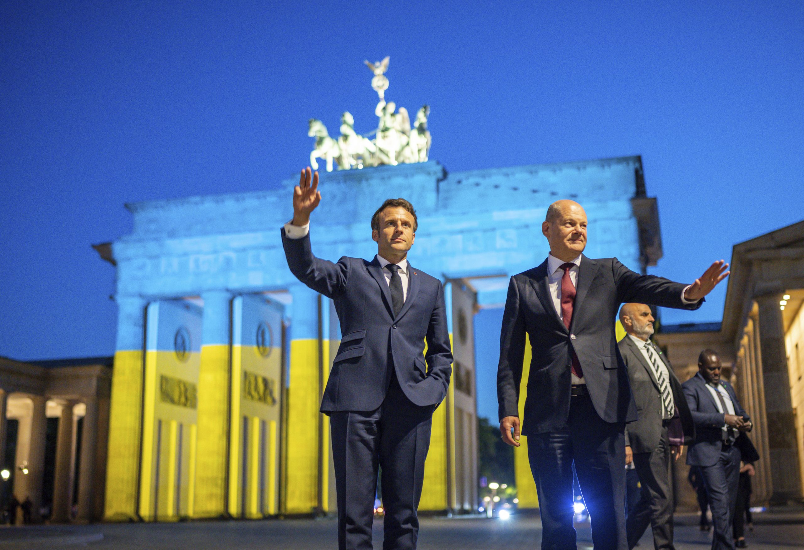(Beta-AFP) – Francuski predsednik Emanuel Makron i nemački kancelar Olaf Šolc pružili su „punu podršku“ Ukrajini večeras kada su zajedno došli do Brandenburške kapije u Berlinu, simbola Hladnog rata osvetljenog ovom prilikom u bojama zemlje koju je napala Rusija.