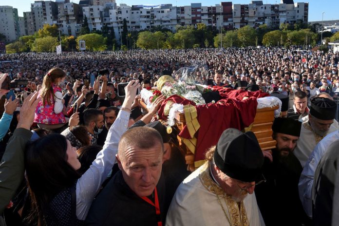 Starešina Hrama Hristovog vaskrsenja u Podgorici Mitrović je u subotu obukao svešteničku odoru i učestvovao u iznošenju kovčega sa telom preminulog mitropolita Amfilohija Radovića iako je nekoliko dana ranije primljen u bolnicu Kliničkog centra Crne Gore, na lečenje od kovida-19.