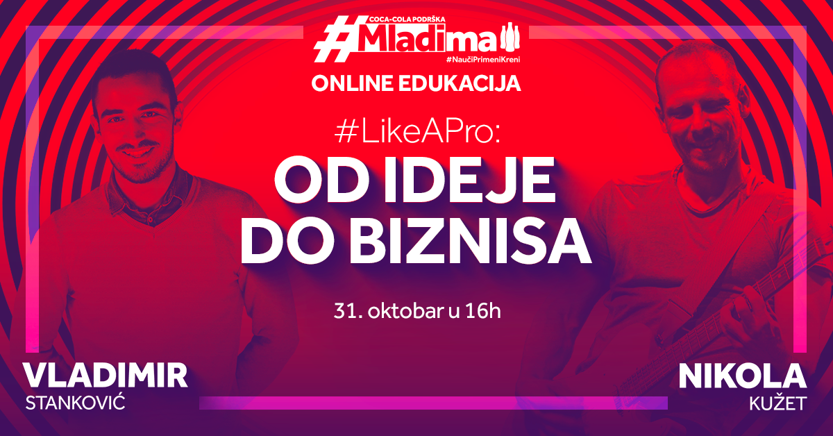 Imate ideju za biznis, ali ne znate da li je dobra i kako uopšte da je pretočite u konkretan posao? Ili ste na početku karijere ili novom poslu i značili bi vam saveti iskusnih ljudi iz korporacija i privatnog sektora? Baš za vas Coca-Cola podrška mladima organizuje predavanje pod nazivom “#LikeAPro: Od ideje do biznisa”, koje se u online formatu realizuje u ponedeljak, 31. oktobra u 16 časova.