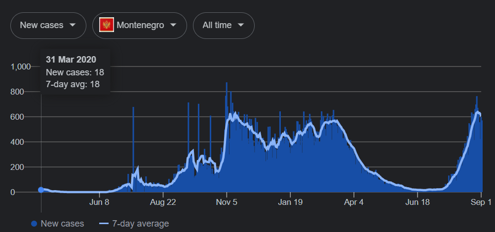 Broj zaraženih u Crnoj Gori od početka pandemije do 1. septembra