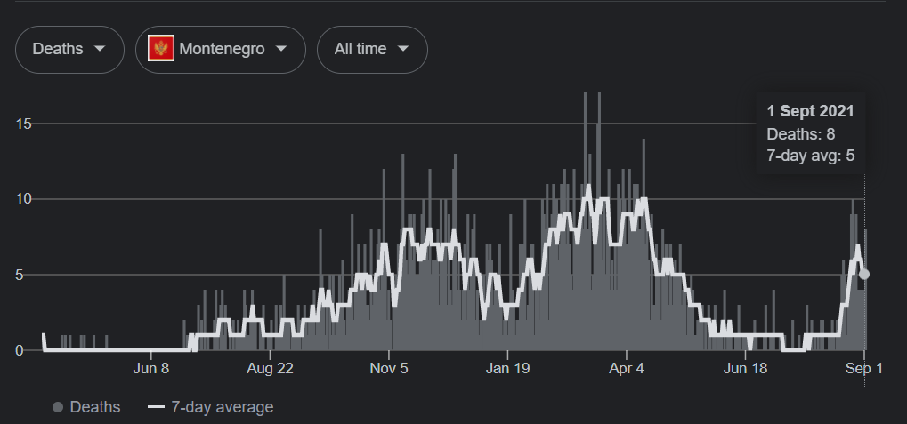 Broj smrtnih slučajeva u Crnoj Gori od početka pandemije do 1. septembra