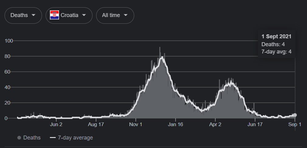 Broj smrtnih slučajeva u Hrvatskoj od početka pandemije do 1. septembra