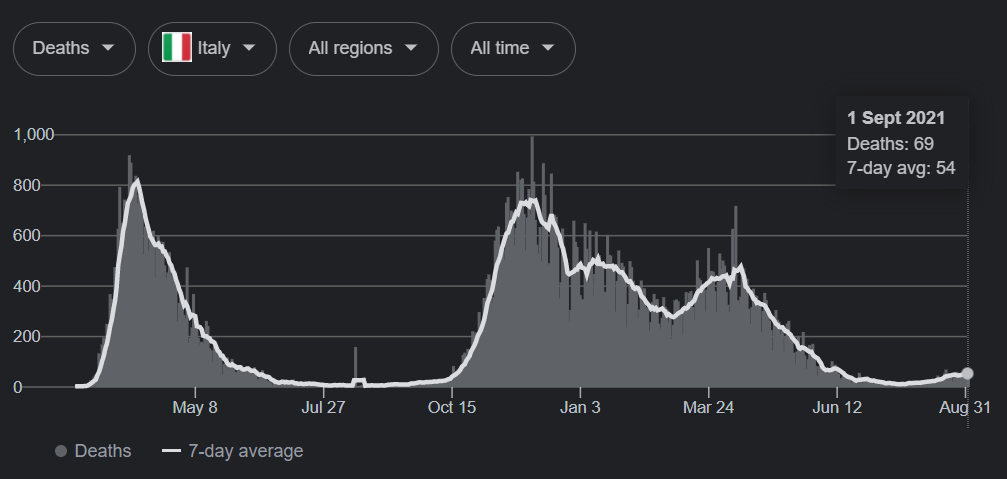 Broj smrtnih slučajeva u Italiji od početka pandemije do 1. septembra