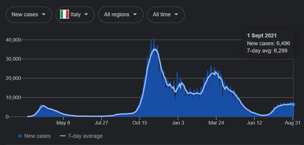 Broj zaraženih u Italiji od početka pandemije do 1. septembra