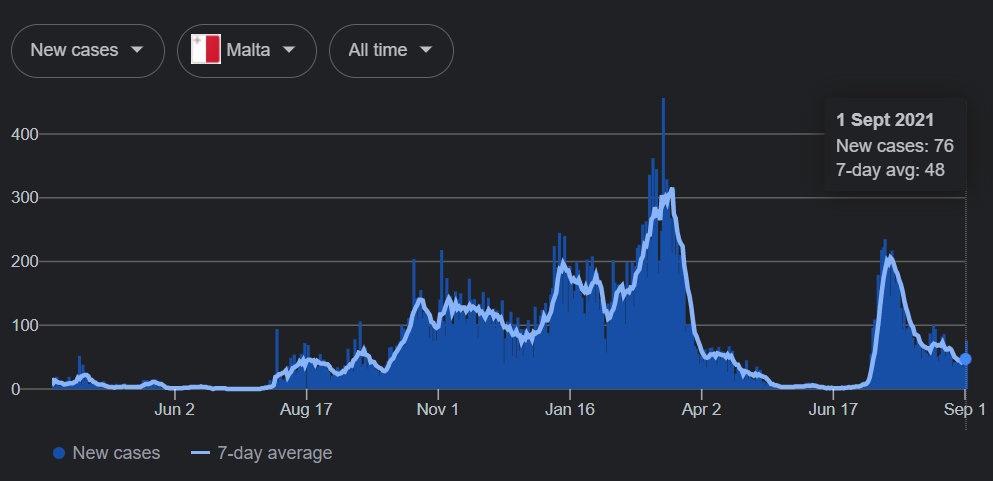Broj zaraženih na Malti od početka pandemije do 1. septembra