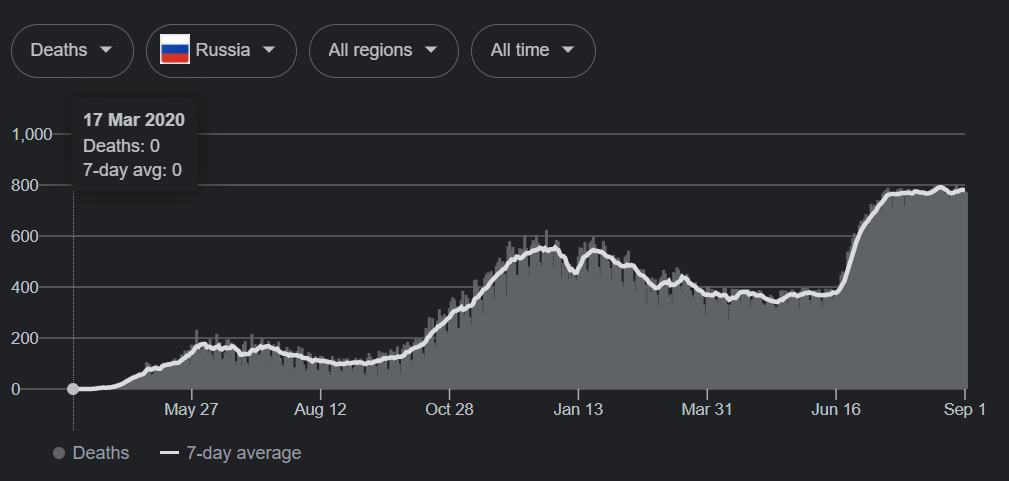 Broj smrtnih slučajeva u Rusiji od početka pandemije do 1. septembra