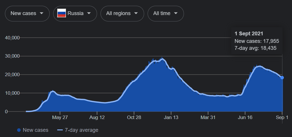 Sa druge strane, uvid u kovid statistiku u Rusiji, usled nedovoljnog broja vakcinisanih (oko 30 odsto), pruža potpuno drugačiju sliku.