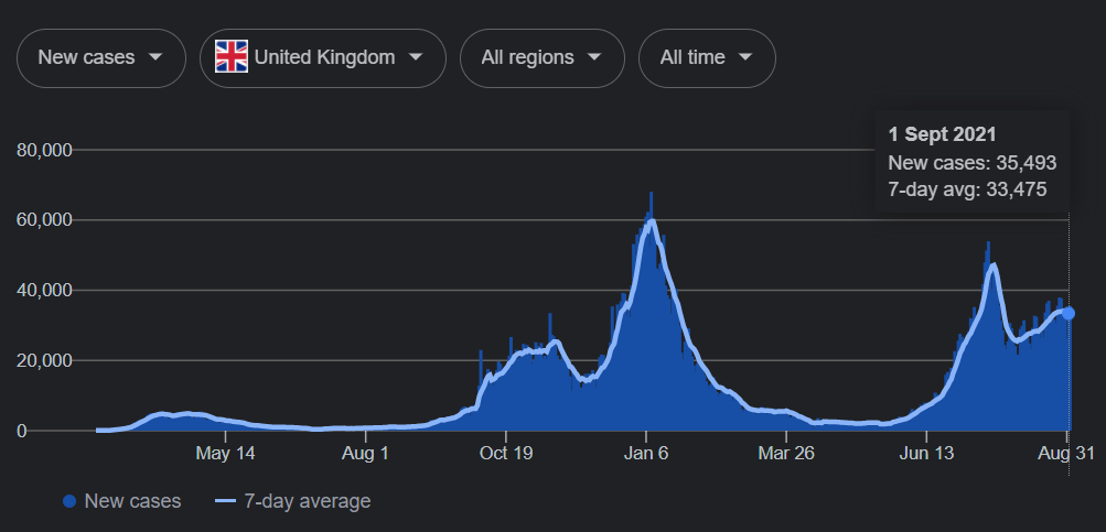 Broj zaraženih u Velikoj Britaniji od početka pandemije do 1. septembra