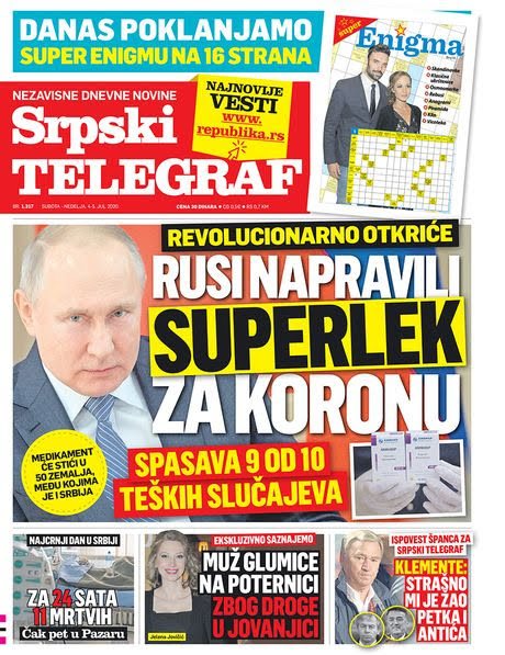 SZO: HLOROKIN NE SMANJUJE SMRTNOST – Svetska zdravstvena organizacija saopštila je da prekida svoja ispitivanja leka za malariju hidroksihlorokina i kombinaciju lekova za virus HIV lopinavir/ritonavir na pacijentima hospitalizovanim zbog koronavirusa, pošto oni nisu doprineli smanjenju smrtnosti.