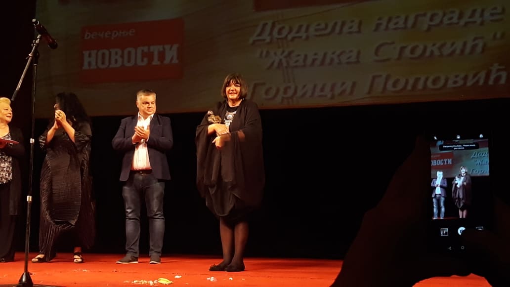 Nagradu za glumačku ličnost u punoj stvaralačkoj zrelosti koja je obeležila pozorišnu, filmsku i televizijsku umetnost, pod imenom slavne Žanke, Gorica je ponela danas na glamuroznoj dodeli u Narodnom pozorištu u Beogradu. Svojim glumačkim darom, posvećenošću umetnosti, markantnošću, prefinjenošću i šarmom, po čemu je slična Žanki Stokić, Gorica Popović odigrala je više stotina uloga.