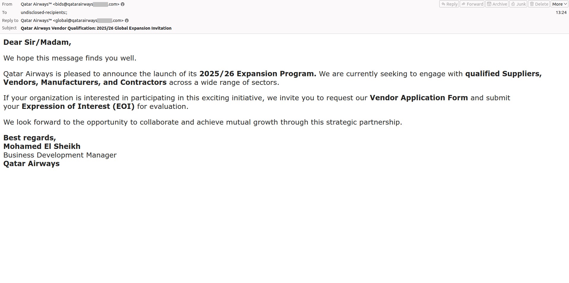 Istraživači kompanije Kaspersky otkrili su nagli porast prevarantskih e-mail poruka u kojima se napadači predstavljaju kao velike avio-kompanije i aerodromi — uključujući Amsterdam Schiphol, Lufthansu, Emirates Airlines, Qatar Airways, Etihad Airways i druge — s ciljem da prevare preduzeća i navedu ih na lažnu komunikaciju u vezi sa isporukama i partnerstvima. Cilj ove šeme je krađa novčanih sredstava od ciljanih organizacija.