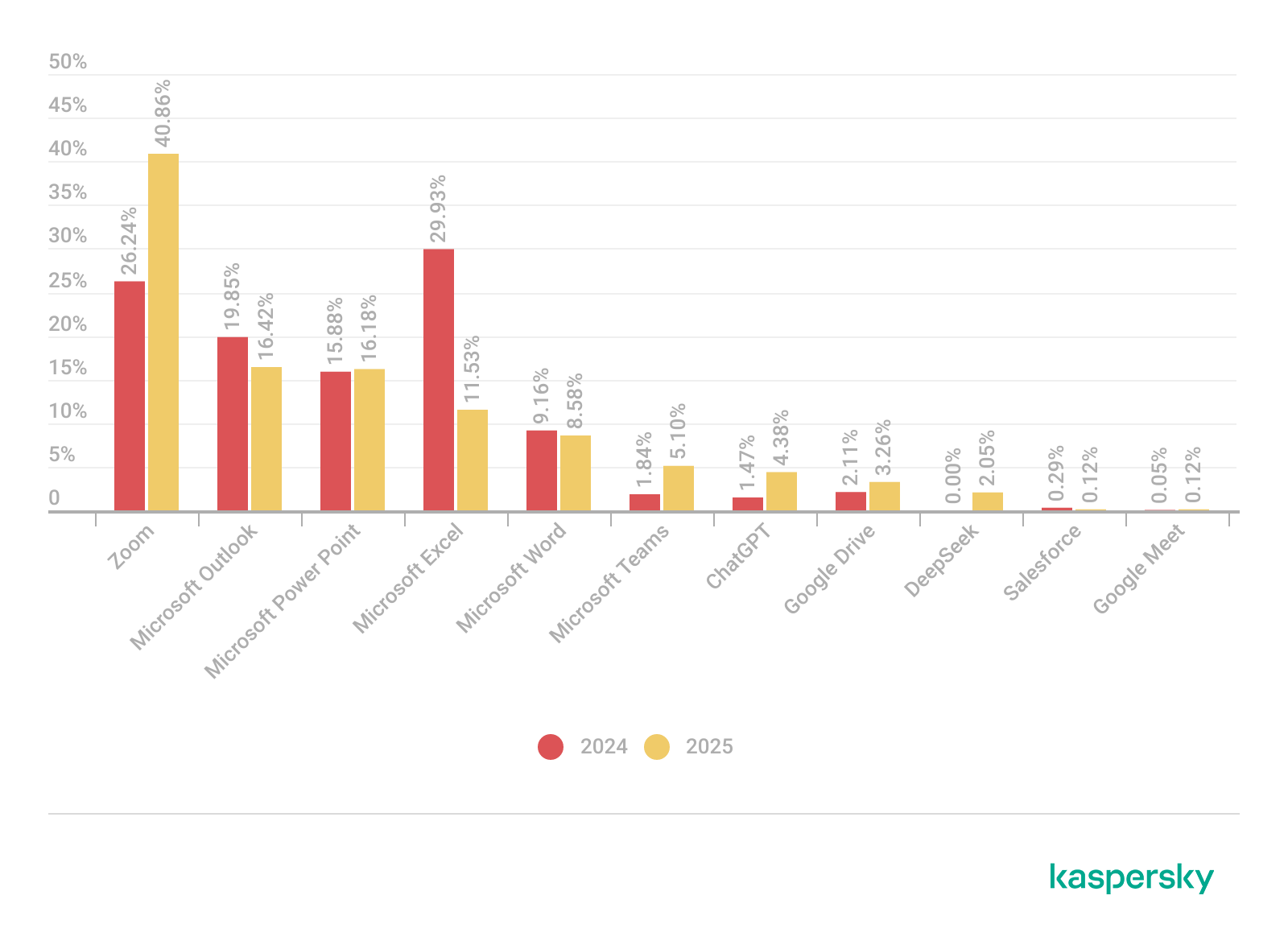 Kaspersky izveštava da se 2025. godine skoro 8.500 korisnika iz grupe malih i srednjih preduzeća (MSP) suočilo sa sajber napadima gde je zlonamerni ili neželjeni softver bio prerušen u neki od popularnih alata za onlajn produktivnost. Na osnovu jedinstvenih zlonamernih i neželjenih datoteka koje su primećene, najčešći mamci su bili Zoom i Microsoft Office, dok su novije usluge zasnovane na veštačkoj inteligenciji poput ChatGPT i DeepSeek sve više iskorišćavane od strane napadača. Kaspersky je objavio strategije za analizu pretnji i ublažavanje kako bi pomogao malim i srednjim preduzećima da odgovore na napade.