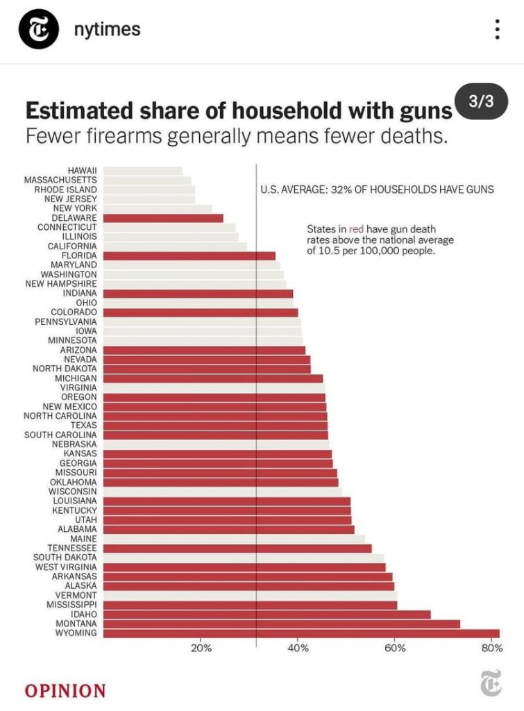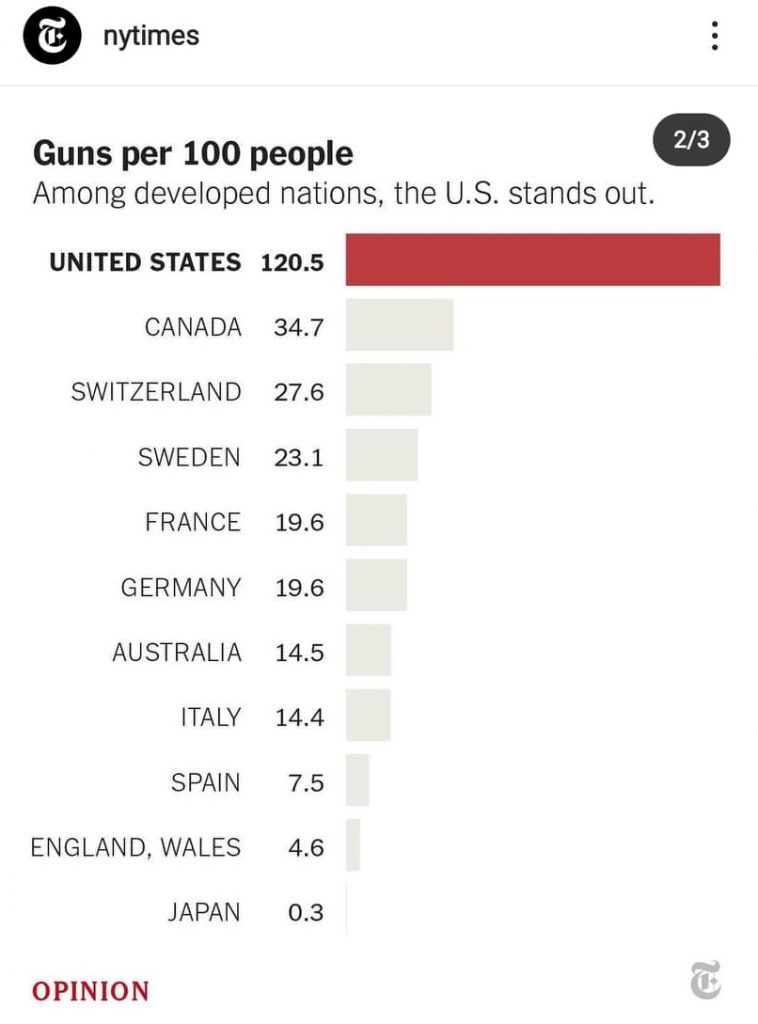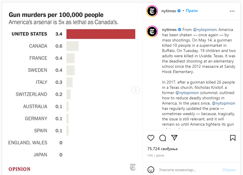 Njujork tajms je na Instagramu podelio statističke podatke za SADkada je reč o o broju ubistava iz vatrenog oružja na 100.000 stanovnika . Amerika je u tom kontekstu daleko ispred Kanade, Švedske, Švajcarske, Australije i Španije.