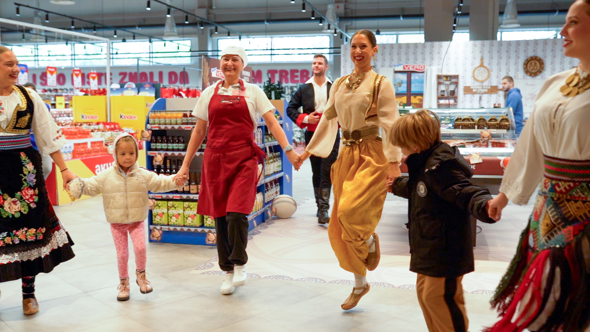 Tokom prethodnog vikenda, market u Novom Sadu bio je mesto gde su kupci mogli da se oprobaju u izradi rukotvorina — od vezenja tradicionalnih motiva do pravljenja suvenira. Posebnu pažnju privukao je trenutak kada se kolo spontano zaigralo među rafovima. Uz narodnu muziku krenuli su plesači u narodnim nošnjama, a velikom brzinom se priključili kupci i zaposleni.