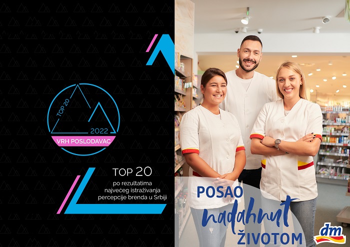 Kompanija dm drogerie markt plasirala se među 20 najpoželjnijih VRH poslodavaca u Srbiji, u okviru istraživanja „TalentX“, koje je sproveo specijalizovani portal Poslovi Infostud. Priznanje za jednog od najomiljenijih poslodavaca i ove godine je dodatno učvrstilo poziciju drogerijskog lanca kao jedne od najtraženijih kompanija za rad, profesionalno napredovanje i stručno usavršavanje.