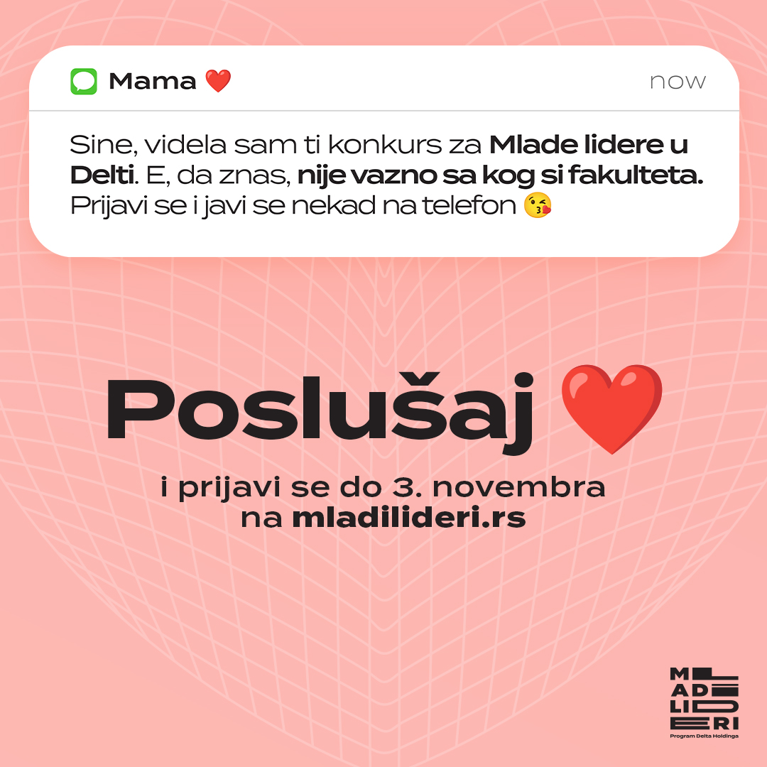 Oni koji nas najviše vole brinu o tome da ne propustimo prilike koje mogu oblikovati našu budućnost. I, baš kao što nas prijatelji i porodica podržavaju na svakom koraku, Delta Holding pruža mladima priliku da započnu karijeru kroz jedinstveni program Mladi lideri. Svi oni koji su se ikada zapitali kojim putem krenuti ili kako započeti profesionalni život treba da poslušaju svoje srce i prijave se na 13. konkurs programa Mladi lideri – jer dobre prilike su ovde u Srbiji.