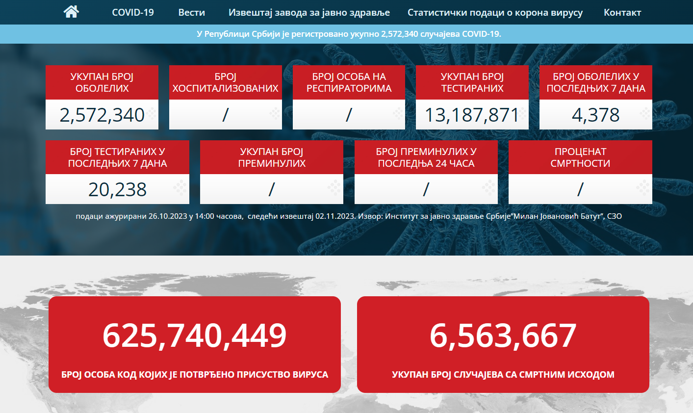 Prema poslednjim podacima, za ovaj period nije bilo hospitalizovanih i preminulih od posledica kovida. Od početka epidemije u Srbiji je potvrđeno 2.572.340 slučajeva kovida, a obrađen je 13.187.871 test.