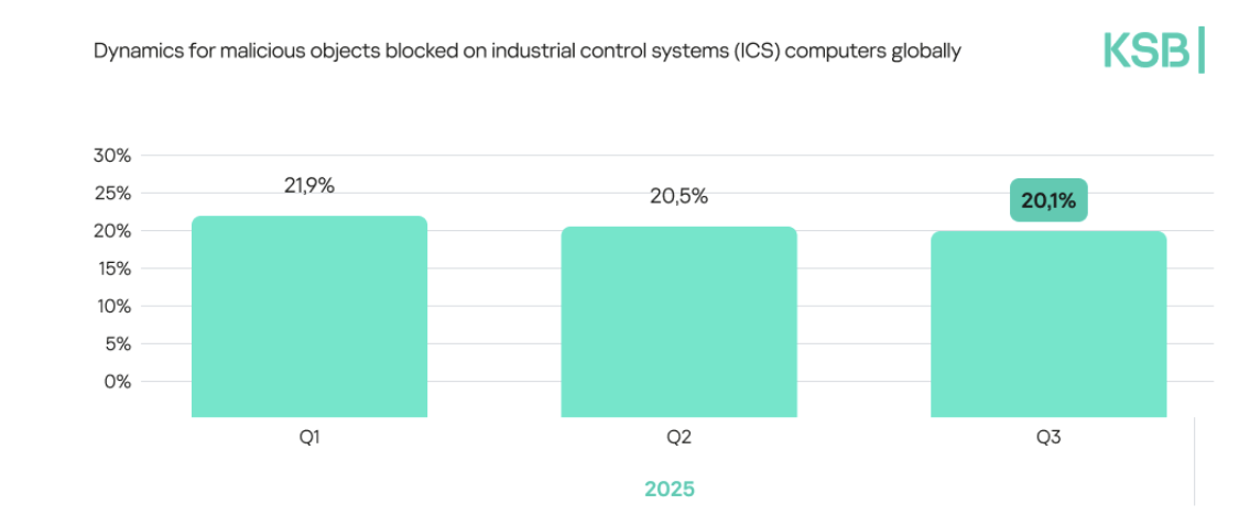 Kontinuirani pritisak na industrijska okruženja sve složenijih globalnih sajber-pretnji obeležio je 2025. godinu. Prema novom izveštaju Kaspersky Security Bulletin, udeo ICS računara napadnutih malverom ostao je visok: kretao se oko 21,9% u prvom kvartalu, da bi opao na 20% do trećeg kvartala. Ovo ukazuje na postepena poboljšanja u odbrani organizacija u pogledu sajber-bezbednosti, uprkos stalnom razvoju taktika napadača. Postoje regionalne razlike – Afrika, Jugoistočna Azija, Istočna Azija, Bliski istok i Južna Azija zabeležili su najveći udeo napadnutih ICS uređaja.