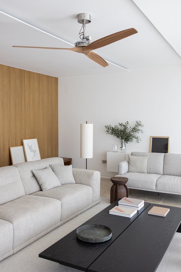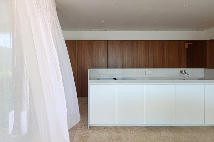 Mekane zavese od prirodnog lana postavljene su uz sve prozorske otvore i prema potrebi suptilno zamagljuju pogled. Funkcionalni, jednostavni i vizuelno neopterećeni ambijenti korisnike upućuju na interakciju sa spoljašnjim okruženjem i čine ovaj dom toplim mestom za odmor u kom je veza s morem i prirodom na prvom mestu.