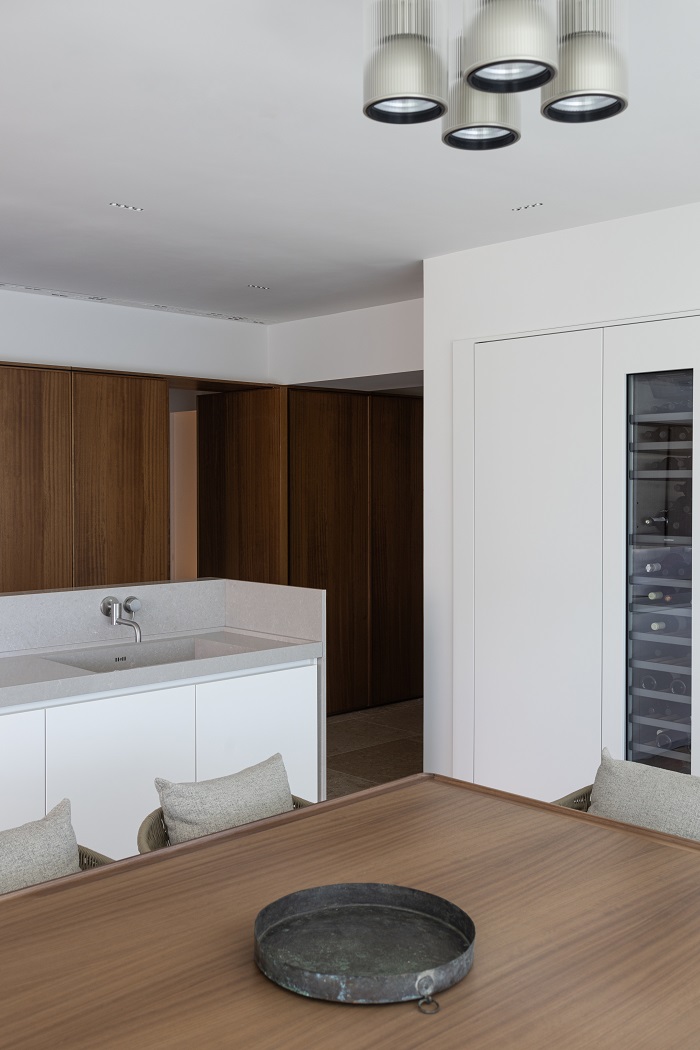 Otvaranjem i povezivanjem prostora na inovativan način, kao i promišljenom i svedenom materijalizacijom, kreirani su jednostavni i prozračni ambijenti u kojima ništa ne ometa pogled. Kontinuirane vertikalne površine prekrivene drvetom i tkaninom u prizemlju, stvaraju utisak fluidnosti prostora i suptilnog ulivanja jedne prostorije u drugu. Kuhinja sa trpezarijom diskretno je odvojena od dugačkog hola, kojim se stiže do svetlog i prostranog dnevnog boravka.
