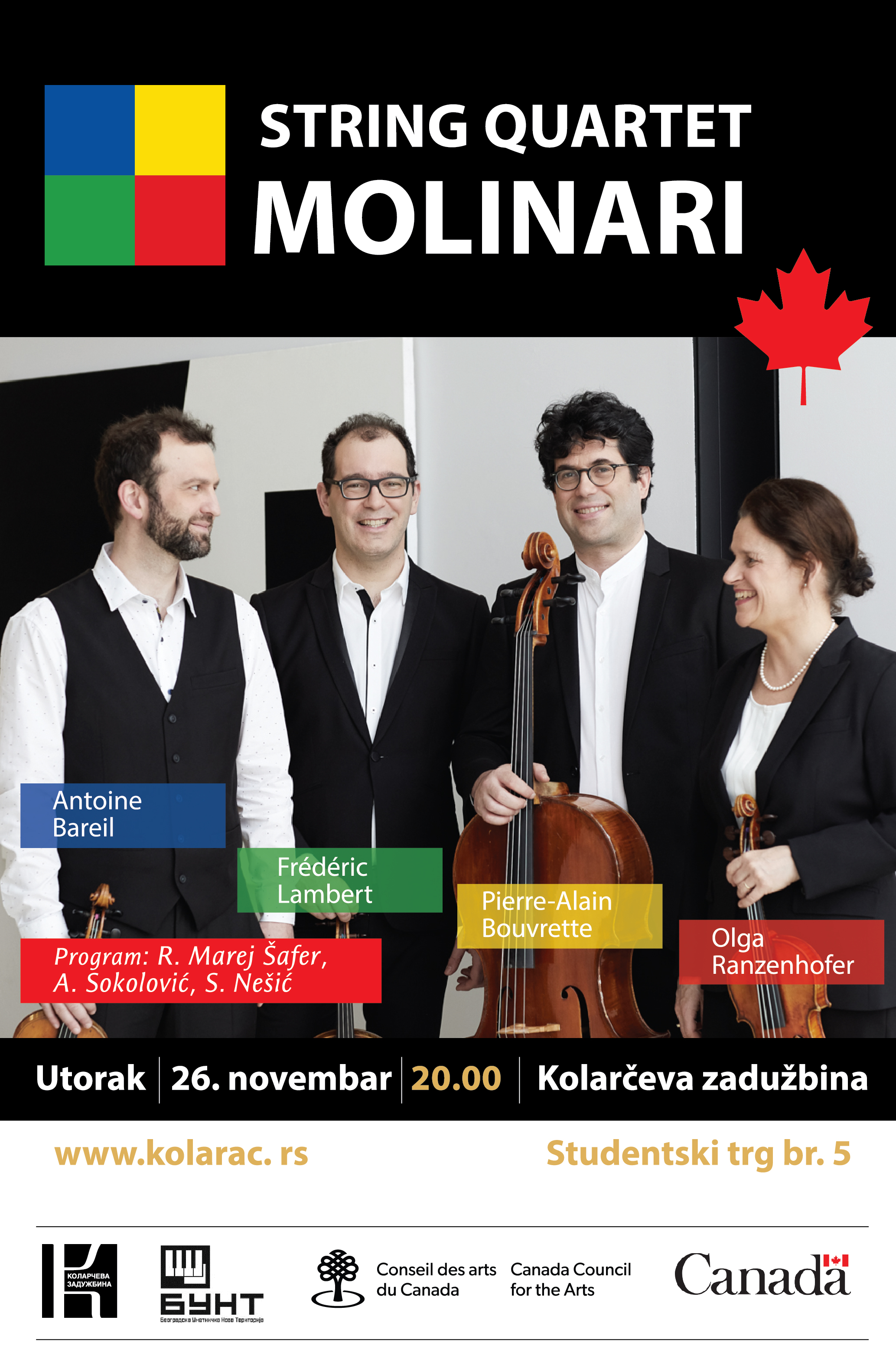 U organizaciji BUNT festivala – Beogradske Umetničke Nove Teritorije i Kolarčeve zadužbine uz podršku Ambasade Kanade, jedan od vodećih gudačkih kvarteta Kanade svetskog renomea Kvartet Molinari premijerno nastupa u Beogradu u utorak, 26. novembra u 20 časova u Velikoj sali Kolarčeve zadužbine. Uz stalne pohvale od međunarodne kritike: dva puta je bio izdvojen kao „izbor urednika“ časopisa „Gramofon“, oduševljene kritike objavili su i ostali muzički magazini, „The Strad“, „Fanfare“, „Diapason. Prestižni nemački „Esho Klassik“ nagradio ga je za izvođenje kamerne muzike 20. i 21. veka. U časopisu „Gramofon“ kritičar Filip Klark kaže za ovaj kvartet: „Nezamislivo je da ijedna grupa muzičara može da svira bolje od ovog montrealskog kvarteta“. Članovi ansambla Olga Ranzenhofer, violina, Antoan Barej, violina, Frederik Lamber, viola, Pjer-Alen Buvret, violončelo će u Beogradu izvesti dela kanadskih kompozitora Rejmond Marej Šafera i Ane Sokolović, kao i Snežane Nešić koja živi u Nemačkoj. Cene karata za koncert su 1000 i 600 dinara. Kvartet Molinari će u okviru svoje evropske turneje imati koncerte i u Makedonskoj Filharmoniji u Skoplju 27. i u Velikoj sali Niškog kulturnog centra 29. novembra u 20. časova.