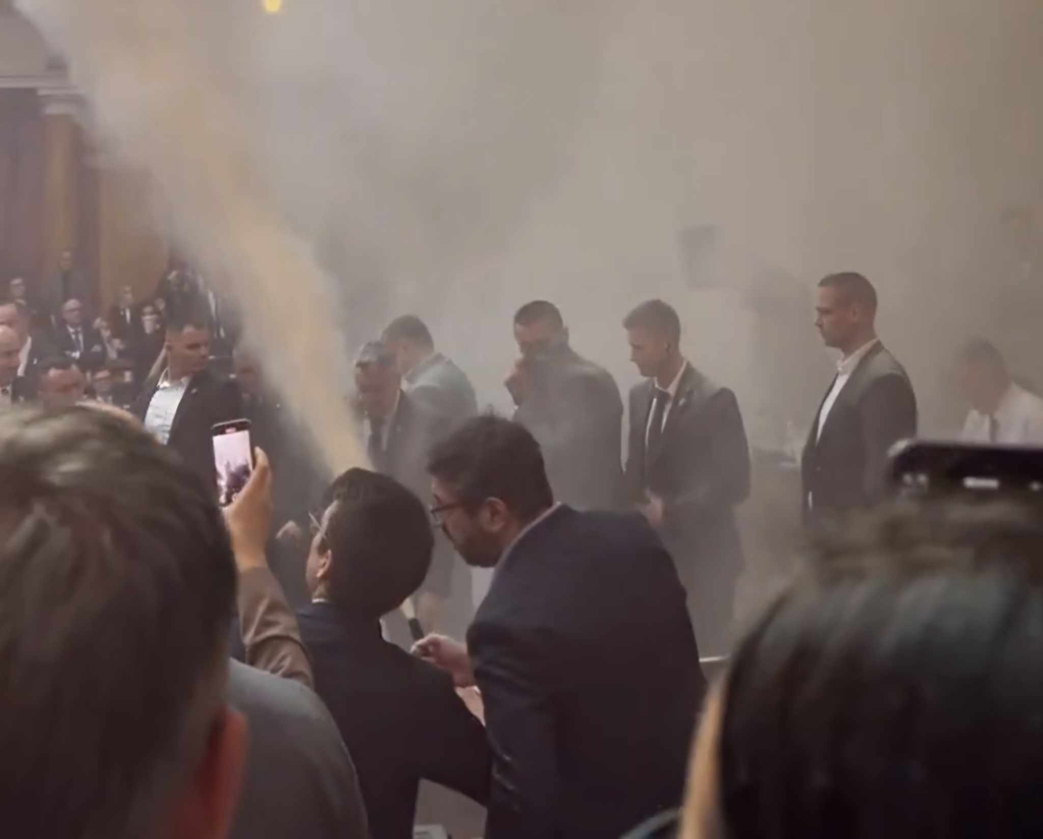 Opozicioni poslanici su tada napustili svoje klupe i krenuli prema stolu predsedavajućeg, nakon čega su upalili crvene i crne dimne bombe i raširili transparent na kojem se pisalo „Srbija ustaje da režim padne“.