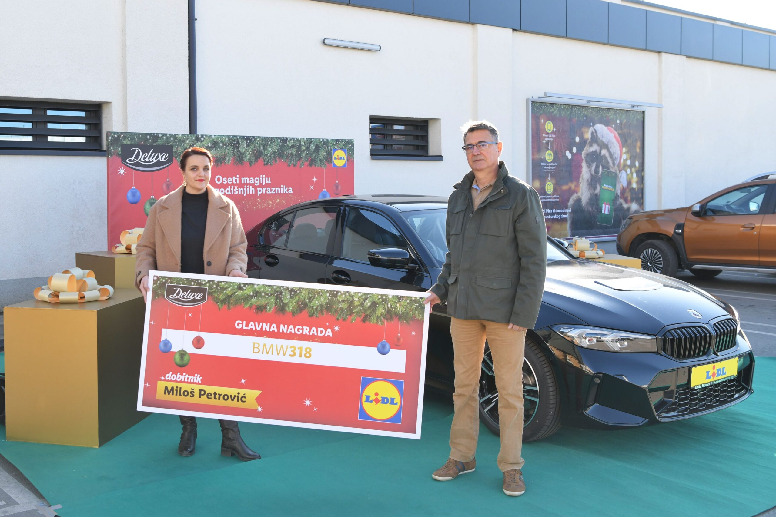 Za srećnog dobitnika glavne nagrade, BMW 318i, u okviru Lidlove Deluxe nagradne igre, izvučen je Mladenovčanin Miloš Petrović, kome su danas, ispred Lidl prodavnice u Mladenovcu, svečano uručeni ključevi novog automobila.