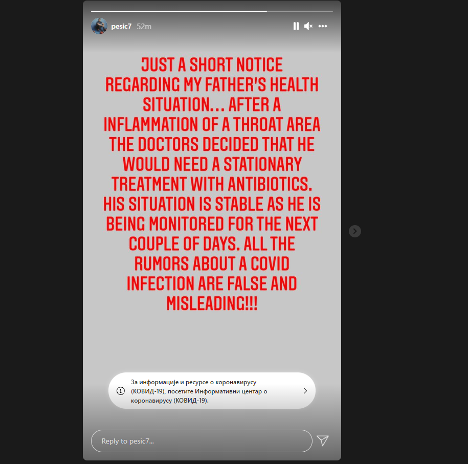 „Samo kratko obaveštenje o zdravstvenoj situaciji mog oca… Nakon upale grla, lekari su odlučili da će mu trebati stacionarni tretman antibioticima. Njegova situacija je stabilna i biće nadzirana narednih nekoliko dana. Sve glasine o kovid infekciji su lažne i obmanjujuće“, napisao je Marko Pešić u objavi na Instagram priči.