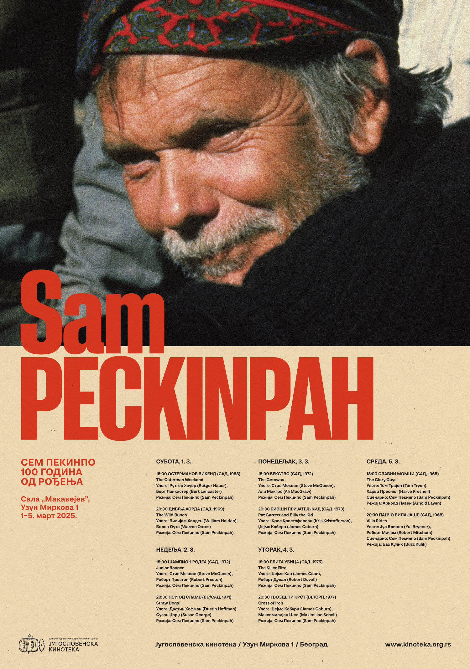 U sali „Makavejev“ od 1. do 5. marta obeležava se sto godina od rođenja američkog reditelja i scenariste Sema Pekinpoa (1925-1984), zaljubljenika u mitove Divljeg zapada. Prve večeri prikazuje se „Divlja horda“ (1969), nominovana za Oskara za scenario, koja je označila prekretnicu u žanru vesterna. Pekinpo je opisivan kao ’filmski pesnik nasilja’, što je potvrdio psihološkom krimi dramom “Psi od slame“ (1971). Na programu su i vesterni „Šampion rodea“ (1972) i „Bivši prijatelj Kid“ (1973), triler „Bekstvo“ (1972), akcioni „Elita ubica“ (1975)…