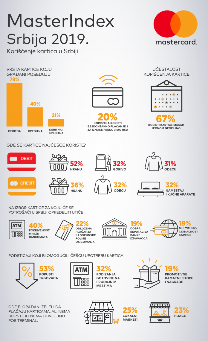 MasterIndex istraživanje je pokazalo da Srbi najčešće koriste debitnu karticu za kupovinu hrane (52%), benzina (32%) i odeće (31%), dok korišćenje kreditnih kartica za njih predstavlja pogodan način za dobijanje dodatnih sredstava ili otplaćivanje na rate, prilikom kupovine odeće (32%), hrane (36%) i nameštaja i kućnih aparata (32%).