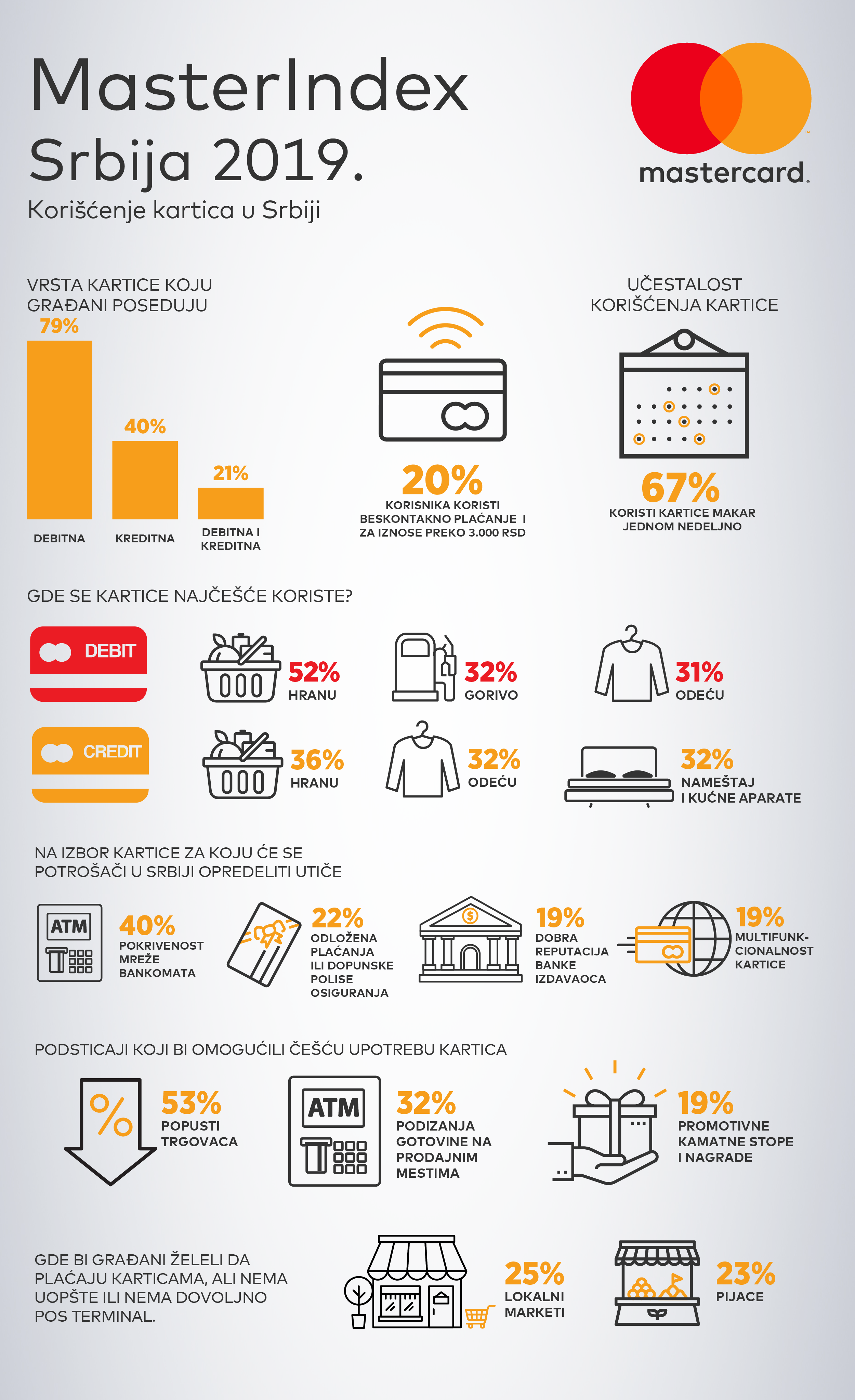 Najnoviji rezultati MasterIndex istraživanja[1] pokazali su da 8 od 10 korisnika kartica u Srbiji poseduje debitnu karticu, dok 40% korisnika poseduje kreditnu karticu, a čak jedna petina poseduje obe kartice. Beskontakno plaćanje je najpogodniji metod plaćanja za iznose do 3.000 RSD, dok svaki peti korisnik ceni ovu pogodnost i za iznose preko 3.000 RSD.