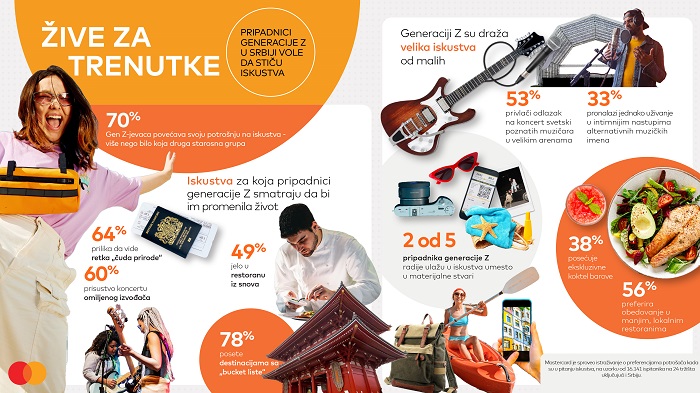 Najpoželjnija iskustva među pripadnicima GenZ, kako ih popularno zovu, su posete destinacijama sa „bucket liste“ (78%), koncerti omiljenih izvođača (60%), poseta retkih „čuda prirode“ (64%) i obrok u restoranu iz snova (49%).