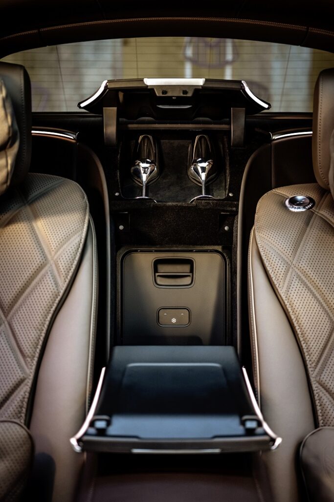 Sa opremom First-Class Rear, prednja centralna konzola se nastavlja kao plutajuća traka na zadnja sedišta. Redizajnirana je za potpuno električni Mercedes-Maybach EQS SUV. Drveni ukrasi krase zadnji deo za odlaganje po prvi put. Dopunjuje drvene ukrase na naslonima prednjih sedišta i između zadnjih sedišta, vizuelno pojačavajući atmosferu dobrog osećaja. Nov je i projector u središnjoj konzoli koji diskretno projektuje Maybach amblem na pod. Kao u modelu Mercedes-Maybach S-Klase, dodatna oprema uključuje dva termo držača za čaše i policu za standardni MBUX zadnji tablet. Četiri USB-C porta za brzo punjenje i dva HDMI interfejsa takođe obezbeđuju da putnici mogu lako da koriste svoje digitalne uređaje. Na zahtev, centralna konzola može da ima dva sklopiva stola, odeljak za hlađenje i posrebreni pehar za šampanjac.