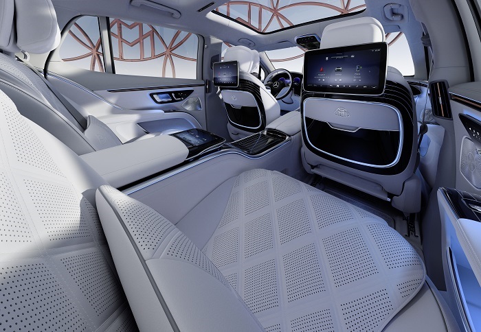 Putnici pozadi doživljavaju isti širok spektar infotejnment i komfornih funkcija sa dva 11,6-inčni displeja na naslonima prednjih sedišta. Sa standardnim MBUX High-End Rear Seat Entertainment paketom, sadržaj se može brzo i lako deliti na različitim ekranima. Takođe je moguće odabrati i izmeniti odredišta za navigaciju sa zadnjih sedišta. Standardna oprema takođe uključuje MBUX zadnji tablet, koji se može koristiti i van vozila, kao i MBUX Interior Assist. Uz pomoć kamera, može prepoznati operativne zahteve putnika iz pokreta tela i ruku i prema njima izvršiti odgovarajuće funkcije – na primer uključivanje svetla za čitanje.