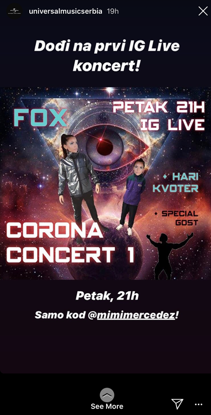 Kada je domaćoj sceni reč, ovakvu incijativu preuzela je upravo Mimi Mercedez, u nameri da motiviše ljude da ostanu bezbedni kod kuće. Koncept koji je za njih pripremila jeste Instagram Live u kome će svake nedelje repovati čitav koncert nekoga od kolega izvođača.