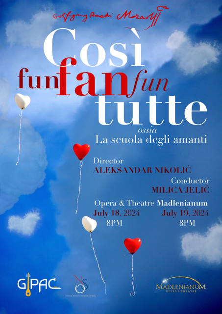 Global Intercultural Performing Arts Cast (GIPAC) iz Pekinga, u saradnji sa Operom i pozorištem Madlenianum s ponosom će predstaviti Mocartovu voljenu operu „Così fan tutte“ (“Tako čine sve”) 18. i 19. jula 2024. godine od 20h u novoj dramaturgiji Aleksandra Nikolića, koji potpisuje i režiju, a Ansamblom Nacionalnog simfonijskog orkestra Srbije dirigovaće maestra Milica Jelić, dok je preparatore pijanistkinja Nevena Živković.