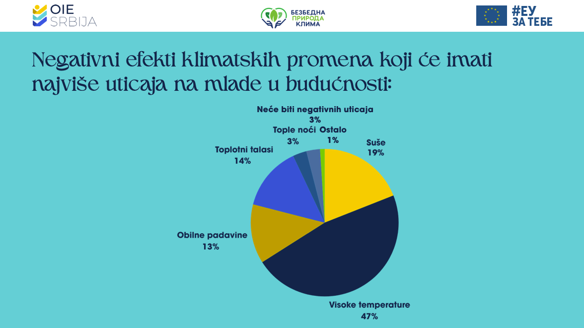 Najveći broj mladih, 47%, izdvaja visoke temperature kao efekat klimatskih promena koji će imati najveći negativni uticaj po generacije mladih u budućnosti u Srbiji. Za 19% mladih najveći negativni uticaj imaće suše, za 14% njih to će biti toplotni talasi, a za 13% obilne padavine.