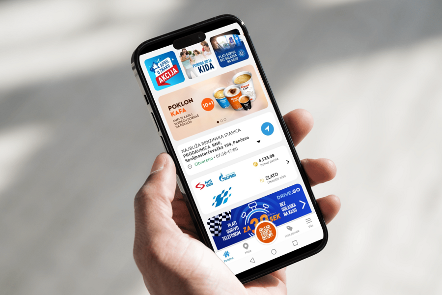 Mobilna aplikacija „Sa nama na putu“ omogućava korisnicima da putem QR koda u mobilnoj aplikaciji sakupljaju i koriste bonus poene prilikom svake kupovine na NIS Petrol i Gasprom benzinskim stanicama. Pored toga što pruža uvid u osnovne informacije kao što su transakcije, stanje bonus poena, obogaćena je i dodatnim funkcionalnostima – pričama koje su dostupne na početnom ekranu aplikacije, koje informišu o aktuelnim promocijama i dostupnim uslugama. Korisnicima je takođe putem aplikacije omogućen odabir i slanje fiskalnih računa na email, a dostupna je i interaktivna mapa koja prikazuje lokacije NIS Petrol i Gasprom benzinskih stanica, njihovo radno vreme i usluge koje nude. Osim toga, dodatne funkcionalnosti, poput personalizovanih ponuda, sakupljanja kupona prilikom kupovine odabranih proizvoda iz asortimana Drive Cafe i dobijanja poklon vaučera, dodatno povećavaju zadovoljstvo korisnika.
