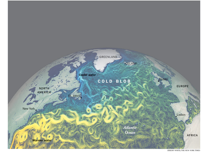 Što nas dovodi do “hladne kapljice”. Skoro svugde u svetu, prosečne temperature rastu – osim na jugoistočnom delu Grenlanda, gde je severni Atlantik postao hladniji. Hladna kapljica, moguće je, signalizira da severna grana Golfske struje više ne dopire istom snagom do severa Atlantskog okeana. Da je sve toplija atmosfera, paradoksalno, dovela do hlađenja jednog dela sveta.