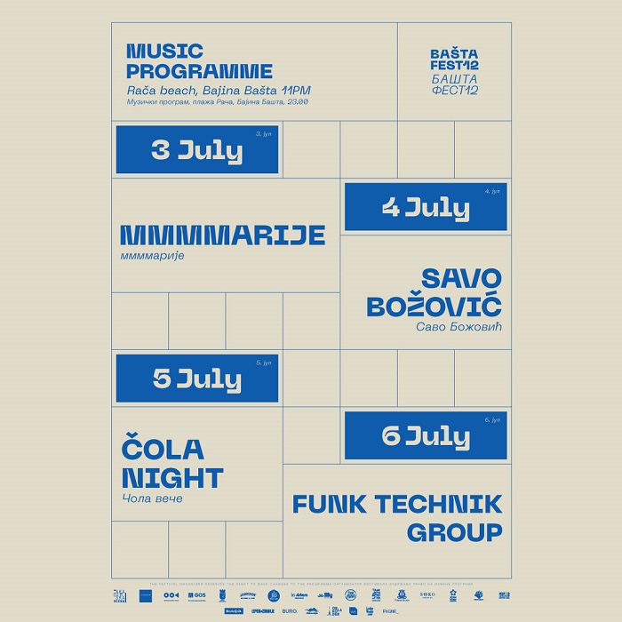Muzički program dvanaestog Bašta Festa, uz koji ćete plesati pod vedrim nebom na plaži Rača pored reke Drine, okupiće originalna imena domaće klupske scene. Na ovogodišnjem festivalu slušaćemo: MMMMARIJE, DJ Savu Božovića, Funk Technik Group – FTG, kao i tradicionalno Čola veče. Muzički program se od prošle godine vratio na plažu Rača, na obalu Drine, od 23h svake noći u toku trajanja festivala.