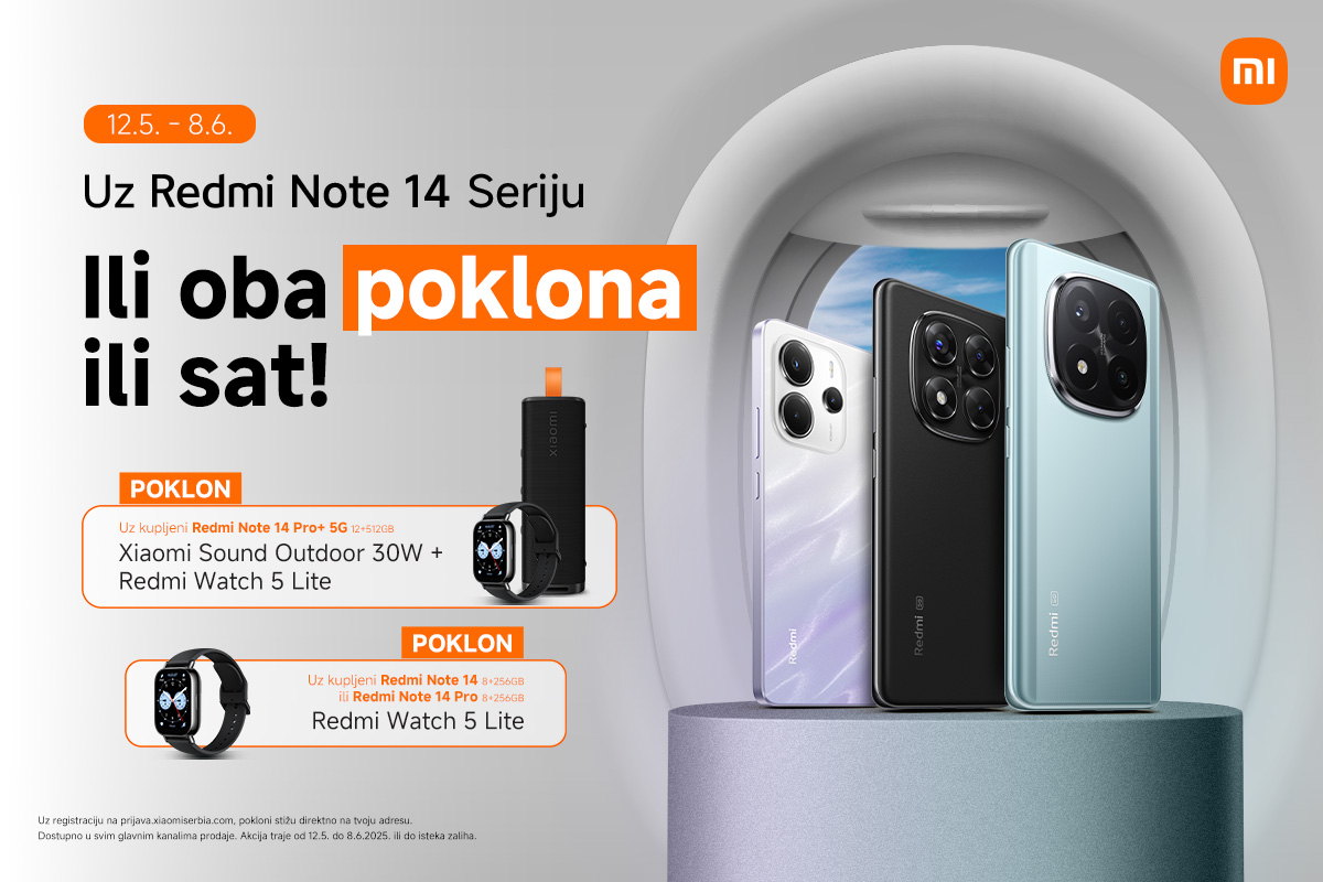 Bilo da biraš telefon zbog moćne kamere, brzine ili izdržljive baterije, uz novu akciju koju je Xiaomi pripremio dobijaš i više od toga. U periodu od 12. maja do 8. juna, kupovinom jednog modela iz Redmi Note 14 serije, na poklon dobijaš Redmi Watch 5 Lite. Ako se ipak odlučiš za Redmi Note 13 Pro+ 5G ili neki od naprednijih modela iz Redmi Note 14 serije, poklon paketu se pridružuje i Xiaomi Sound Outdoor 30W. Sat koji prati tvoj tempo ili zvučnik koji pravi atmosferu – uz određene modele, dobijaš oba.