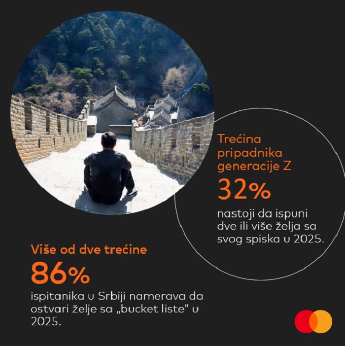 Prema anketi koju je sprovela kompanija Mastercard, više od 15.000 ispitanika širom Evrope, uključujući i iz Srbije, otkrilo je da čak dve trećine njih (70%) smatra ostvarivanje aktivnosti sa svoje liste želja prioritetom u 2025. godini. Glavni motivi variraju: 44% ispitanika želi da stvori nezaboravne uspomene, 39% teži da svet doživi na potpuno nov način, dok 44% želi da svoja iskustva podeli sa voljenima. Predvodnici ovog „pokreta liste želja“ su pripadnici generacije Z i to čak njih 32% iz Srbije nastoji da ispuni dve ili više želja sa svog spiska u ovoj godini.